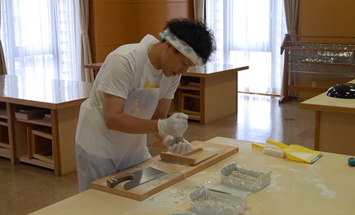 ふれあい館に響く、そば切り包丁の音。結構重いのです、この包丁。