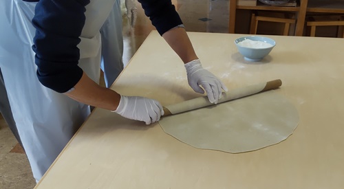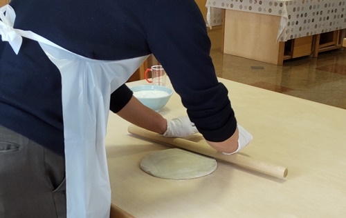 ふれあい館館長の指導の下、鮮やかな麺棒捌きで伸ばされていく生地。