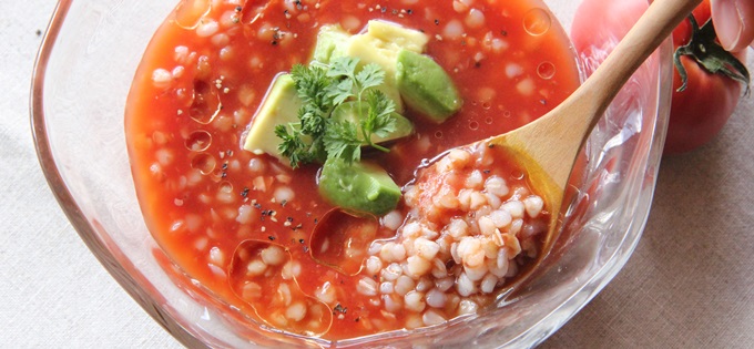 そば米のサラサラとした食感は冷製トマトスープによく合います。食欲の落ちる季節にもピッタリ。