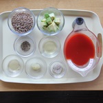 - トマトジュースに、すりおろしにんにくとハチミツ、ハーブソルトを加え、味を調整する。