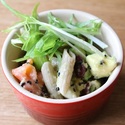 アボカドやサーモンをそばペンネと一緒に特製ドレッシングで和えました。小麦や玄米のペンネでも代用できます。アンチエイジングフードマイスター・倉島のぞ美先生監修レシピ。銀座NAGANOセミナー公開レシピ(2016年11月開催)