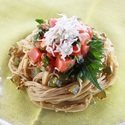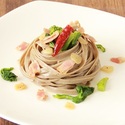 信州そば粉入りパスタを冷麺風にアレンジしました。お酢の酸味がしっかり効いてさっぱりした味わい。そばつゆベースのスープが、そばパスタと相性バッチリ!