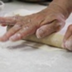 - おやきの生地を直径13~15cmになるように、中央は厚く外側は薄くなるように麺棒で均一にのばす。