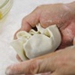 - 3の上に2を入れて外側の皮を持ち上げて中央に集め、指で押しておさえる。