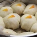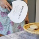 - 蒸しあがったら皿にとり、うちわで15秒ほど強くあおぐと、膨らんだおやきが締まり、つやがでる。裏返して同じく15秒ほど強くあおぎ、表に返して出来上がり。