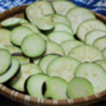 - おやきの具を作る。丸なすを7~8mmの厚さに切り、5分位水につけてアクを抜き、ザルにあげてキッチンペーパーで水分をふきとります。