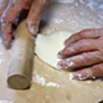 - おやきの生地を直径13~15cmになるように、中央は厚く外側は薄くなるように麺棒で均一にのばします。