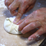 - 3の上に2を置き、外側の皮を持ち上げて中央に集め、指で押しておさえます。