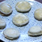- 蒸しあがったら皿に取り、うちわで15秒位強くあおぐと、ふくらんだおやきが締まり、つやがでます。裏返して同じく15秒位強くあおぎ、表に返して出来上がりです。