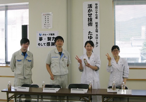 松本工場では、開発本部・品質管理部・生産管理部・そば製造部の4名の先輩が、日々取組んでいる自分の業務の説明や学生さんからの質問に答えさせていただきました。