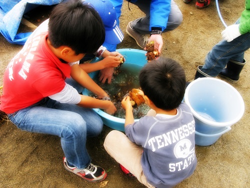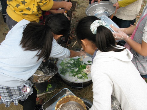 まずは里芋を冷たい水でゴシゴシと。 あまりに頑張ってゴシゴシしたせいか、手がかゆくなる子供続出。