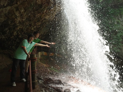 別名「裏見の滝」とも呼ばれ、滝の裏側からこうして直接水に触れることも出来ます。水しぶきが何とも涼しい!