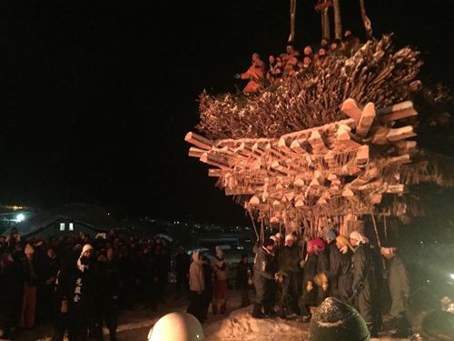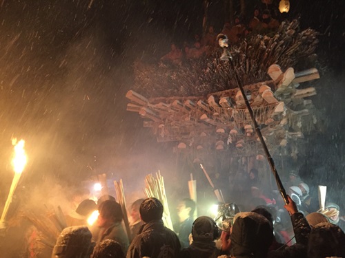 祭りの前日から手作業で作られた社殿の上に42歳が上がり、下には25歳が待ち構えます。火をつけようとたいまつを手に押し寄せる村人たちからおよそ1時間半もの間、必死に社殿を守ります。野沢温泉で男として生まれ育ったからには誰もが通らなければならない伝統行事。この祭りに参加したことでやっと「一人前の男」として認められるのだとか。