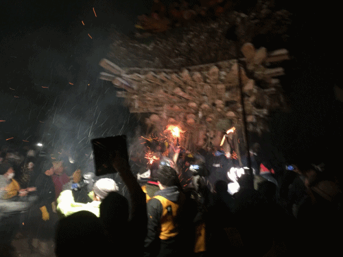 午後8時半をまわり、いよいよ「火付け役」である村人とこれを防ぐ厄年の男性陣との間で激しい「炎の攻防戦」が始まりました!