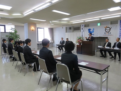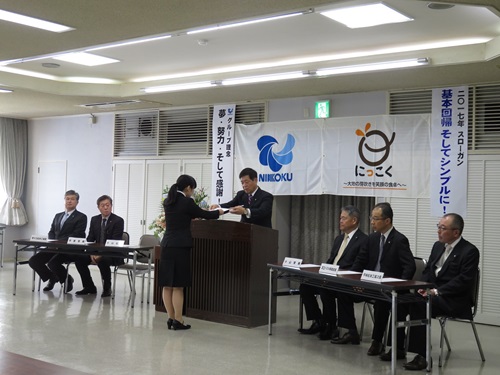 本社において平成29年度新入社員入社式が行われました。まだまだ緊張気味の7名です。