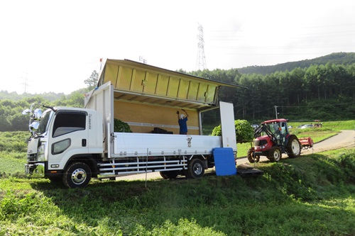 刈り取った若葉は配送の為、すぐに横付けしたトラックへと積み込みました。
