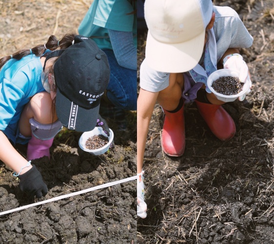 圃場の半分はばら撒きスタイルに。豆まきのように勢いよく撒いてもらいました。