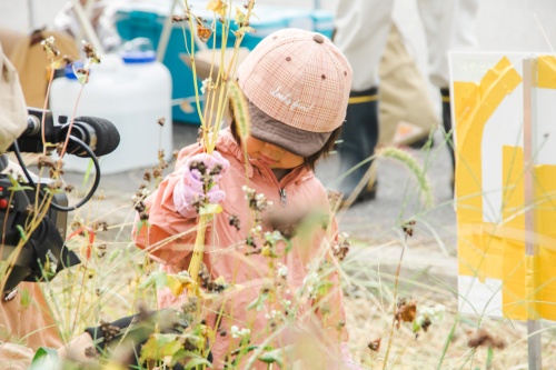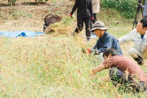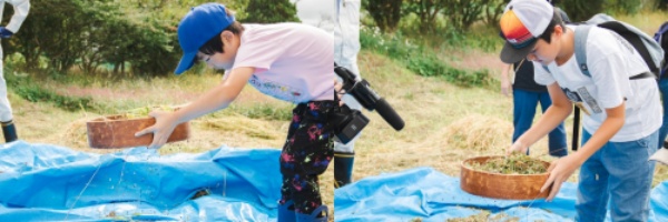 今回の刈り取り作業では、子どもたちは手で株を引き抜き、大人の参加者は鎌を用いて刈取りを行いました。