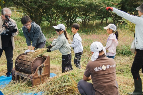 毎年恒例の昔ながらの脱穀機を使って脱穀していきます。
