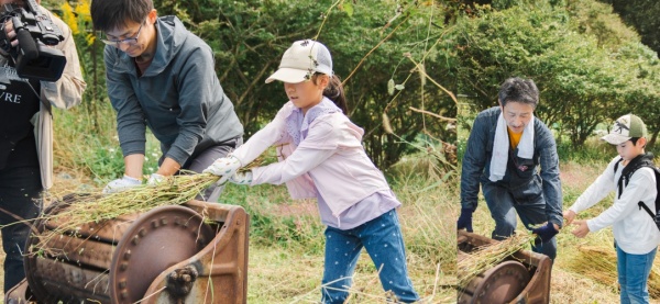 最初は初めて触れる機械に不安そうだったものの、「脱穀できた!」という達成感が笑顔に表れていました。