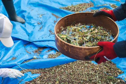 こちらが、コンバインで刈り取った直後のそばの実たち。