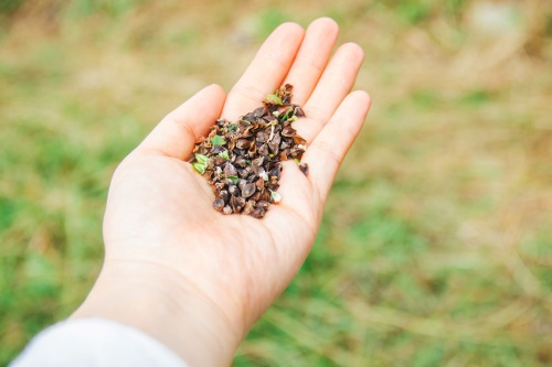 花や葉、雑草などが混ざっていますが、何度かふるいを使ってゴミを取り除き、そばの実だけに仕上げていきます。