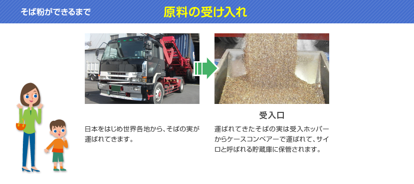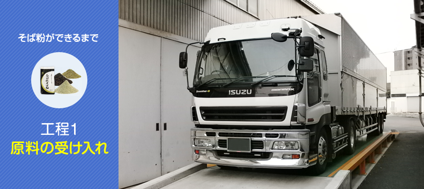 まずは、工場に原料の「そばの実」が運び込まれます。