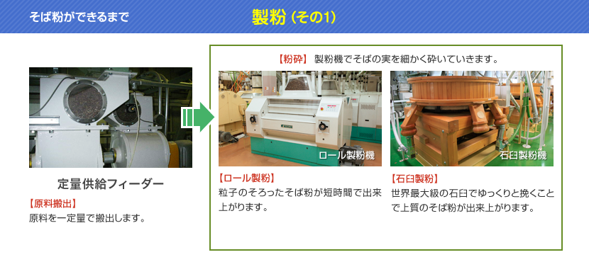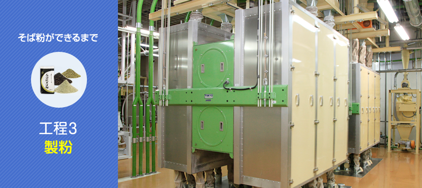 製粉機を使って、そばの実を砕き細かい粉状にします。