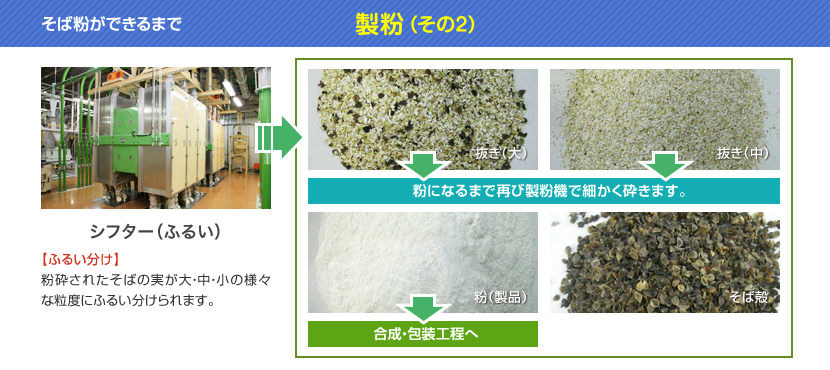 粒の大きさで、再製粉するものと、製品状態の粉を分けます。