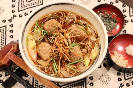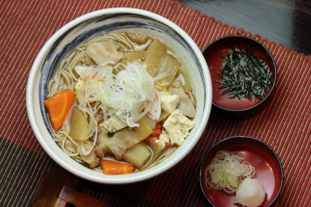 炊いた鴨肉を温かいそばの上にのせ仕上げました。