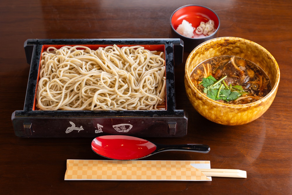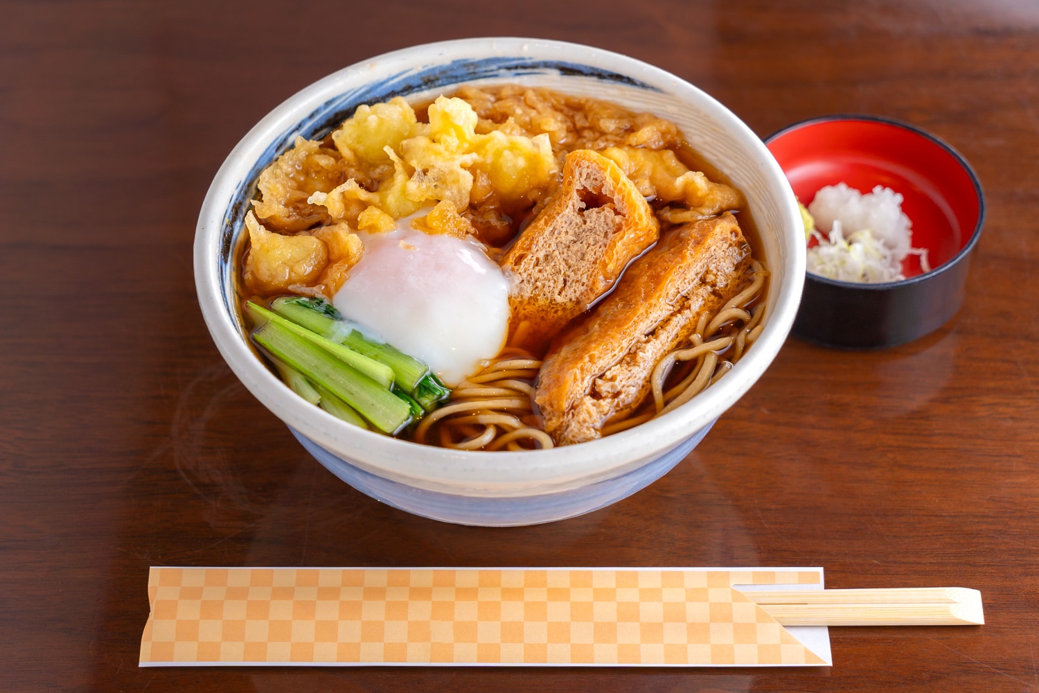 「信州りんご和牛」の牛すじ肉をやわらかく煮込み、牛の旨みがたっぷり溶け込んだつゆに仕上げました。