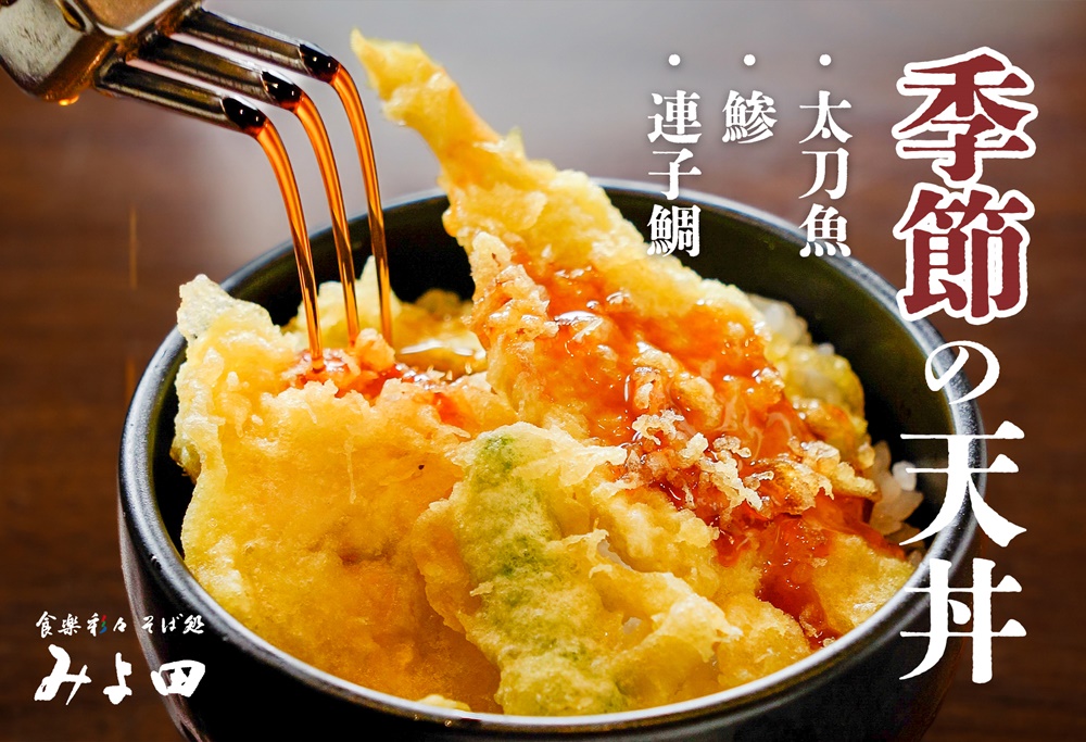 現在ミニ丼は、季節限定の「生桜海老天丼」と「焼肉丼」、定番の「季節の天丼」と「まぐろたたき丼」の4種類の中からお好きなものをお選びいただけます。