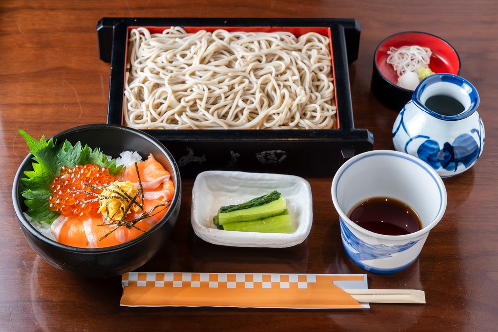 おそば(せいろ又はかけそば)、ミニ丼、漬物がセットになった大人気のみよ田定食。