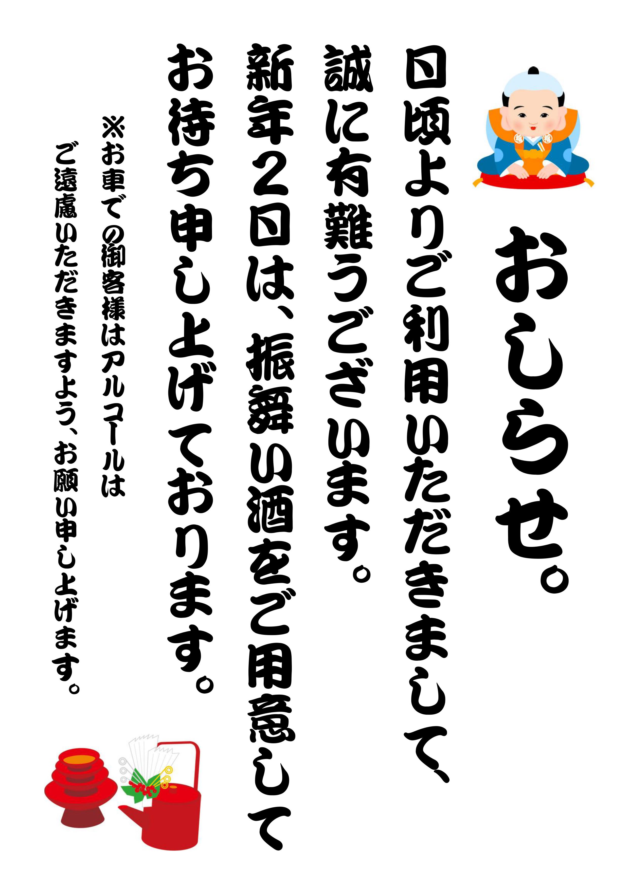 なお、12/31日はPM6:00、翌年2日は午後8時迄で3日から通常営業になりますので
