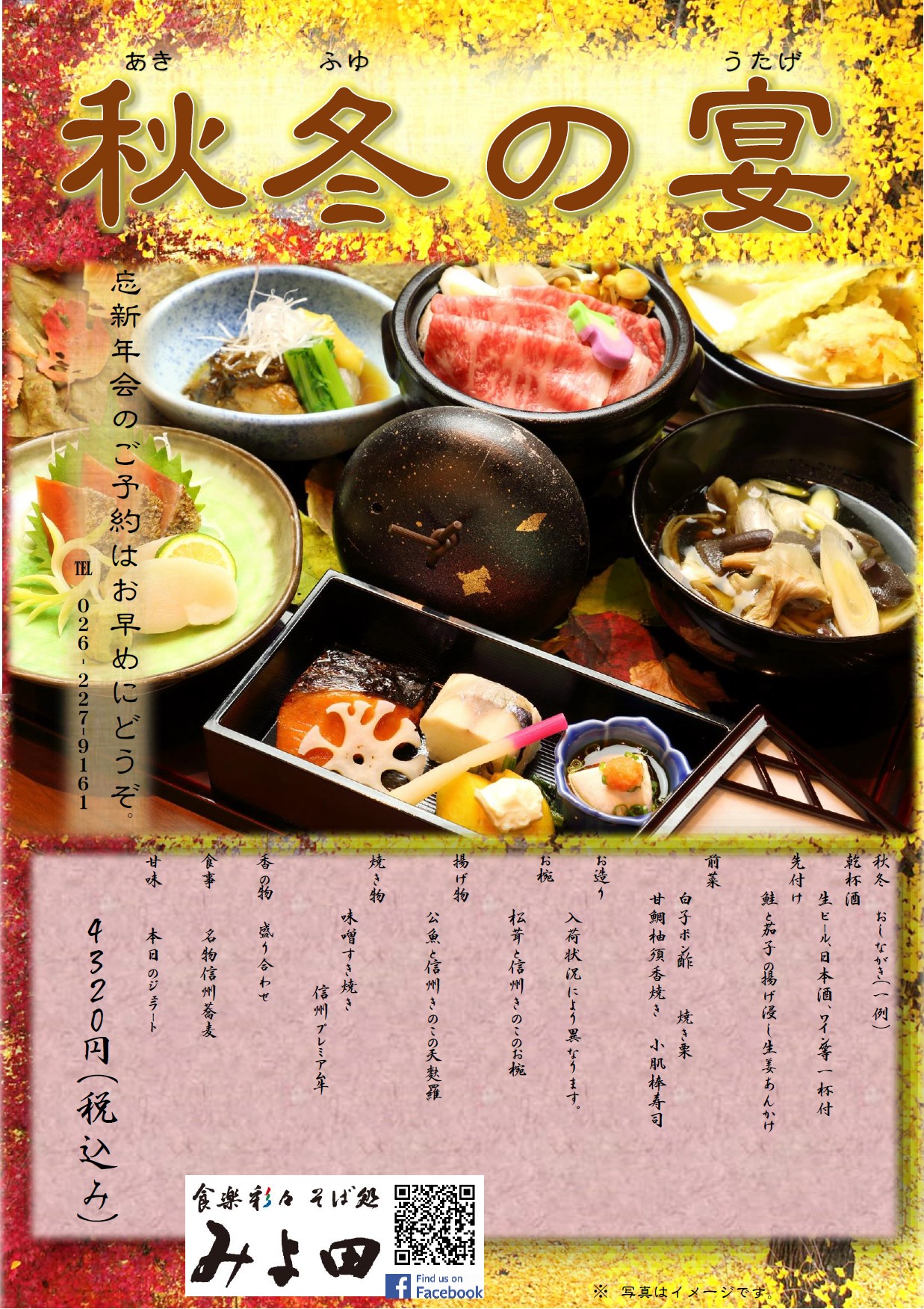 そば処 みよ田では「秋冬の宴」と題して、これからの季節にピッタリな宴会プ