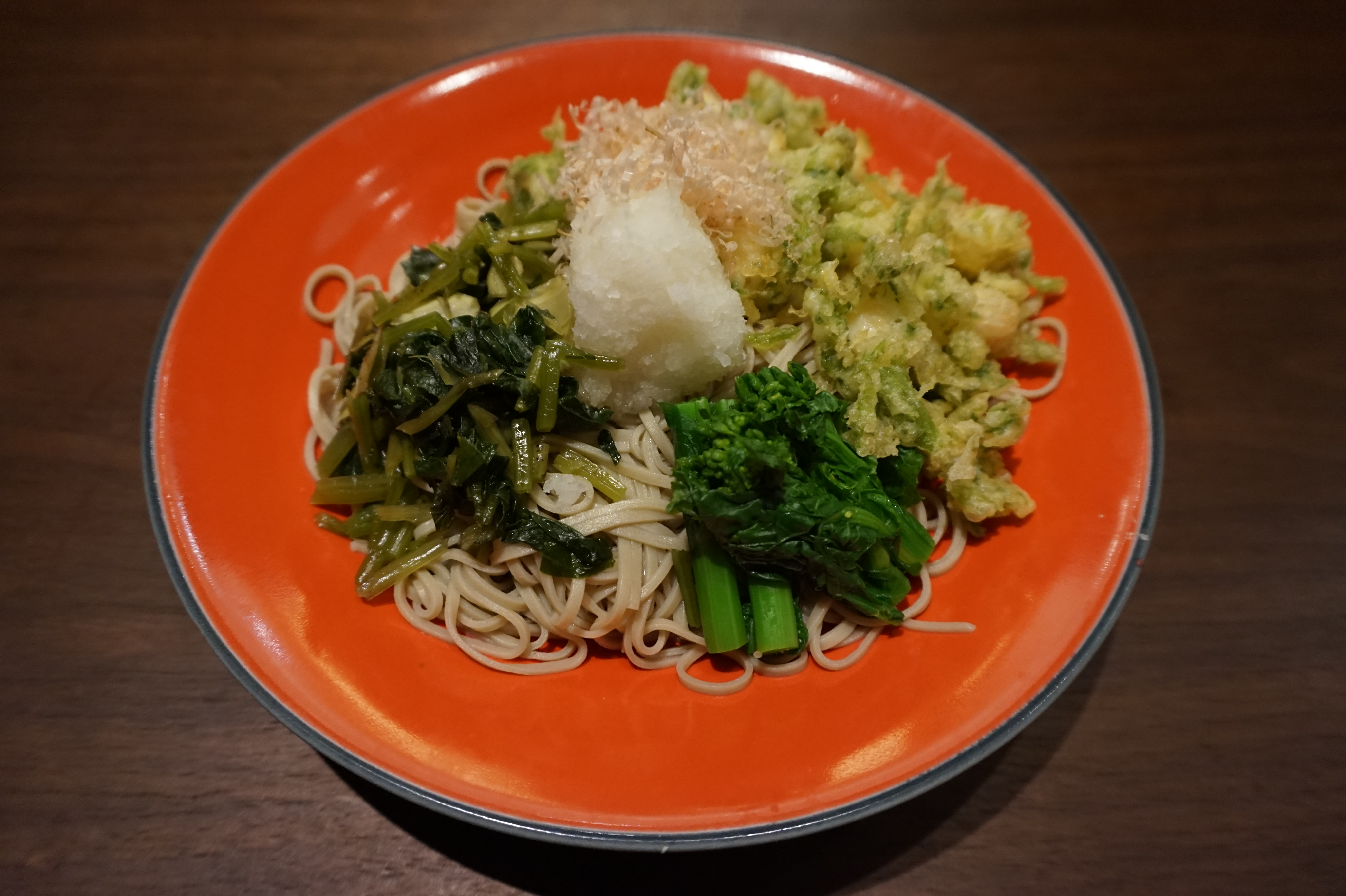 揚げ玉変わりに海からの春、生海苔入りの小柱天をちらして、里の春、菜の花と葉わさびを添えた
