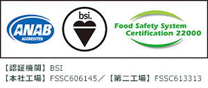 食品の製造工程において健康被害が発生するリスクを企業自体の考え方だけで管理するのではなく、国際的に信頼された食品安全としての規格であるFSSC22000による管理手法を導入することにより、さらにゆき届いた衛生管理と安全で安心な商品の製造を実現しました。