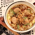 牛すじ肉を柔らかく煮込んで、根菜ときのこを入れた温かいつけ汁でお召し上がりください。
