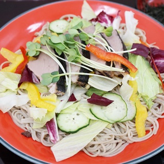 - お皿にそば、サラダ、1を盛り付け、2のドレッシングをかけます。