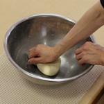 - 練り終わったら、ボウルの側面を利用して空気を出すようにして円すい状にする。