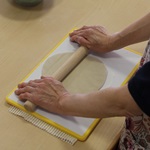 - まな板に打ち粉をふり、生地をのせ麺棒で直径10cmくらいまで延ばす。