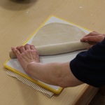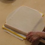- 生地を麺棒に巻きつけ、そのまま板の上を前後に3往復する。