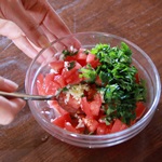 - トマトは角切りにし、しそはこまかく刻む。Aと混ぜ合せておく。