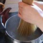 - 大きな鍋にたっぷりのお湯を沸騰させ、塩(分量外)を入れる。ゆで上がったパスタを冷水でしめる。