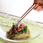 冷製のカッペリーニにたっぷりの具材をのせ、さっぱりだけど満足感のある一皿。