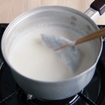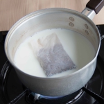 - 鍋に牛乳と水出しそば茶パック1袋をそのまま入れ火にかける。