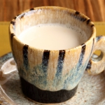 - 火を止め、そば茶を取り出しラテをカップに注いで完成。