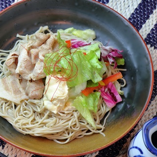 - ゆでたそばの上にサラダ、豚しゃぶ、味噌ジンジャー、糸唐辛子を盛り付ける。そばつゆをかけ、お好みでねぎ、大根おろし、のりをトッピングする。