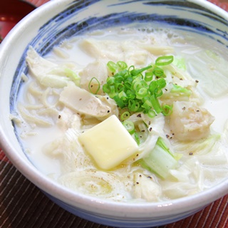 - 器にそばを盛り、スープをかける。ブラックペッパーをふりかけ、小口切りにした万能ねぎをのせる。お好みでバターと刻みのりをトッピングする。