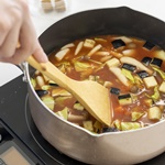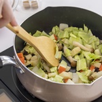 - 3の野菜が柔らかくなったら、コンソメ・砂糖・塩・胡椒を加え、味を調える。